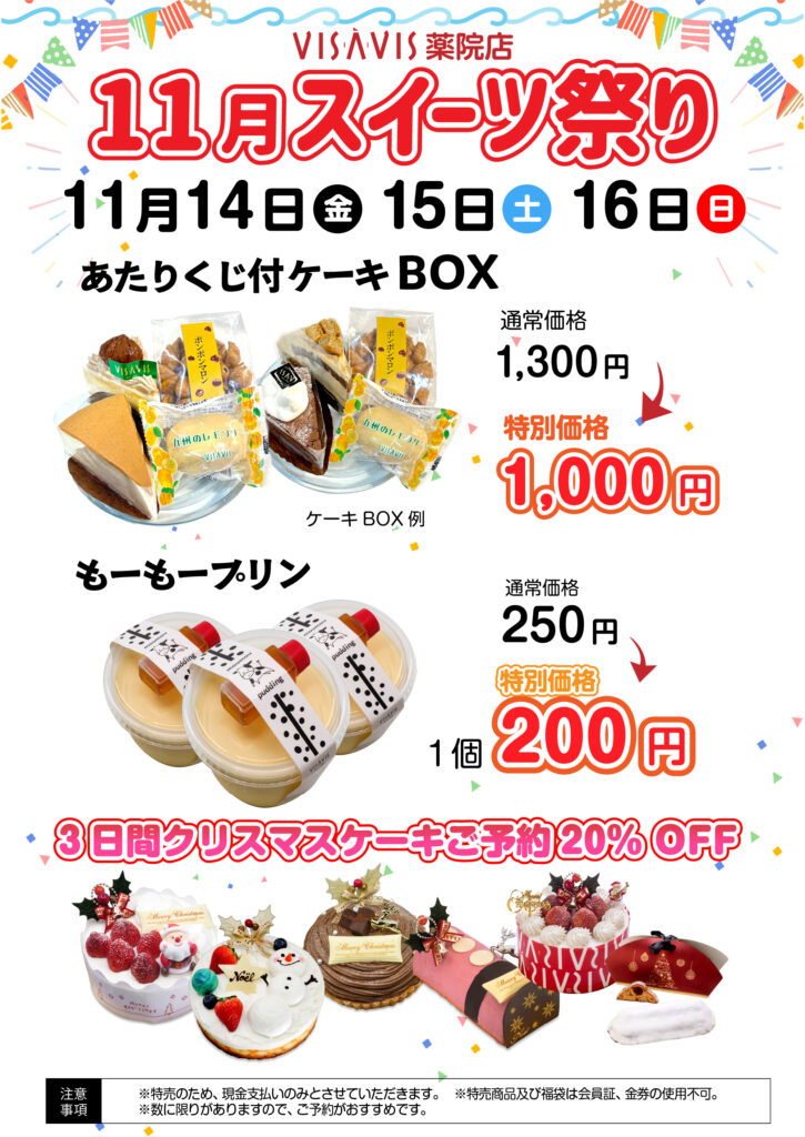 薬院店11月スイーツ祭り 2025年11月14日 最終更新日時 : 2025年11月14日 visavis 11/14(金)・15(土)・16(日)の3日間限定‼ 薬院店にて 「11月スイーツ祭り」 を開催いたします🎉 🎁 あたりくじ付きケーキBOX 通常1,300円 → 特別価格 1,000円✨ いろんなケーキ&焼菓子が入ってとってもお得🍰さらにあたりくじ付🎯 🥛 もーもープリン 通常250円 → 特別価格 200円✨大人気のなめらか濃厚プリンをこの機会にぜひ😋 レモンケーキ 通常240円 → 特別価格 3個500円(数量限定)