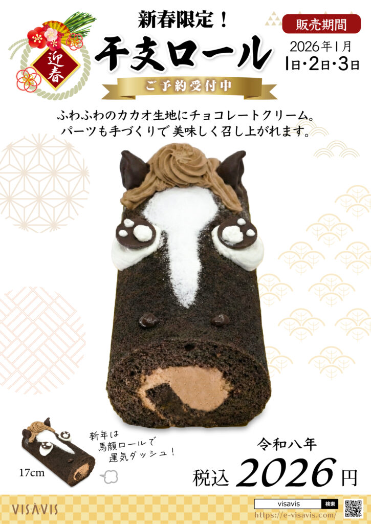 ふわふわのカカオ生地に、濃厚なチョコレートクリームを巻き上げ、干支(午)をモチーフにしたパーツも手づくりで仕上げました。